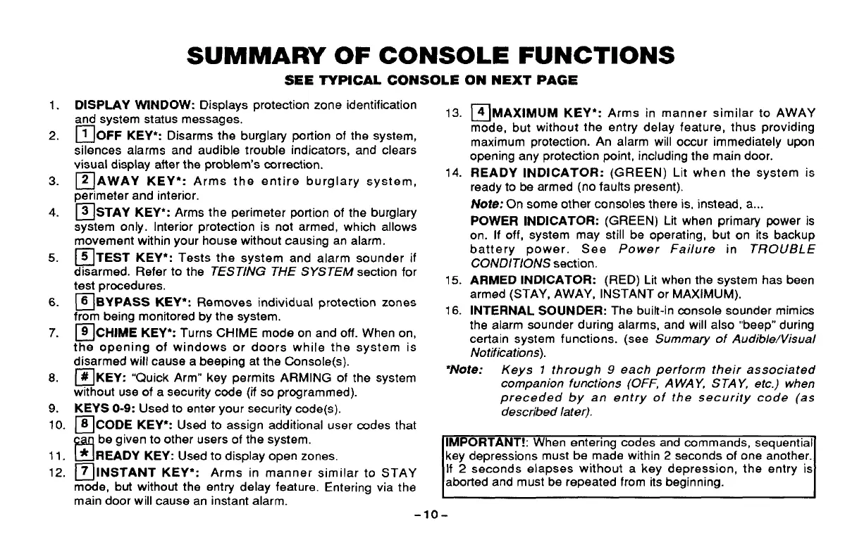 ❑ AWAY KEY*: Arms the entire burglary system,