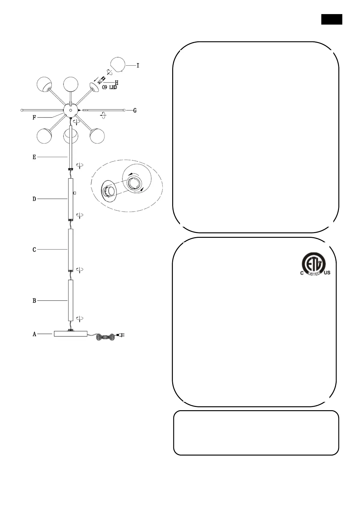 5. Enrosque el poste (G) en el cuerpo de la lámpara (F)