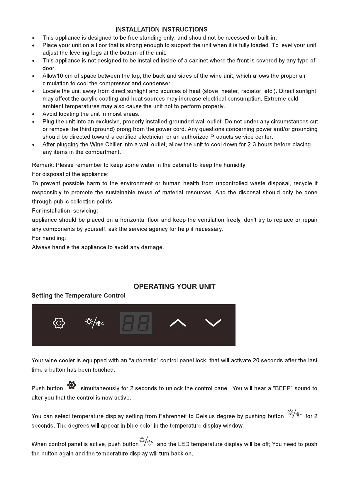 Adexa JC-98 - Installation Instructions; Installation Guidelines; Operating Your Unit; Setting the Temperature Control