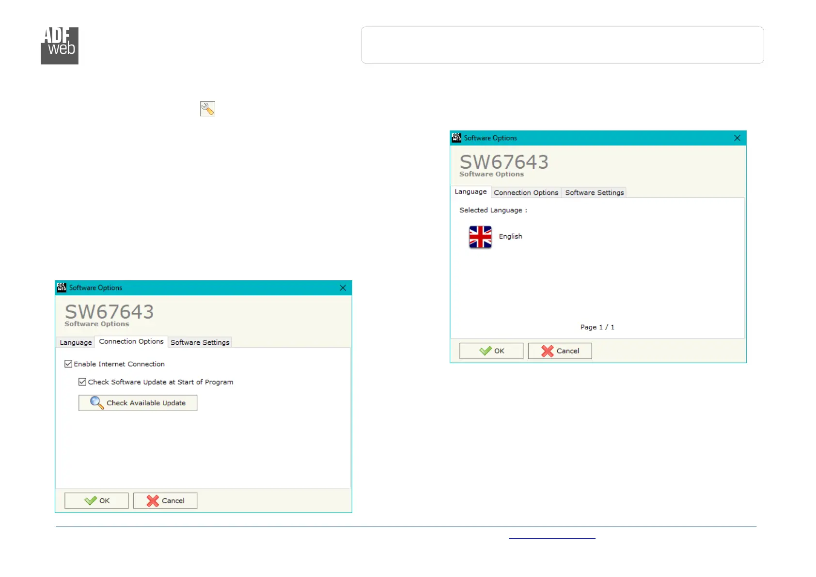 By pressing the “Settings” ( ) button there is the possibility to change the language of the software and check the updatings for the