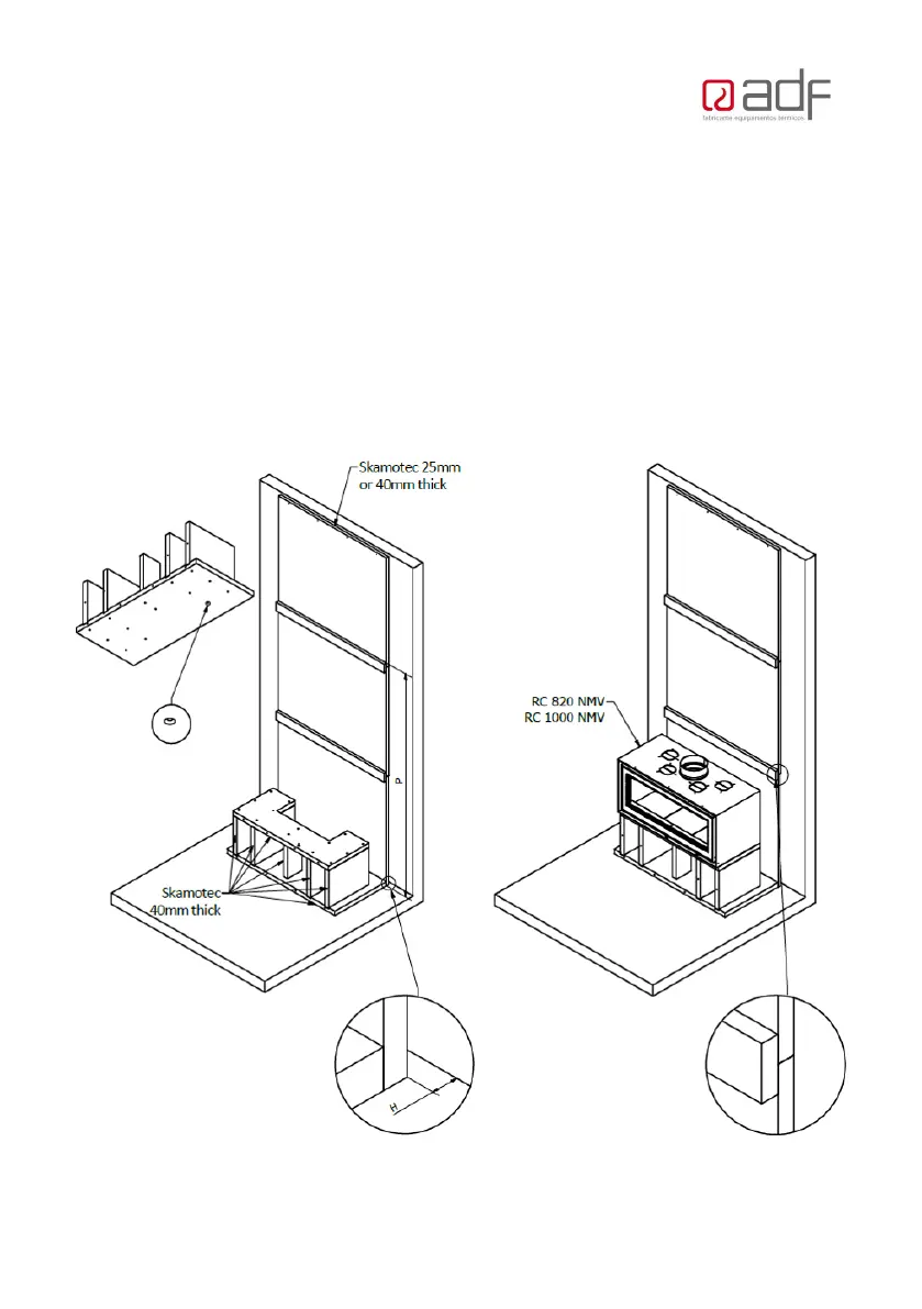 The assembly includes a 30mm air gap behind the rear sheet to combustible material. Use Skamotec