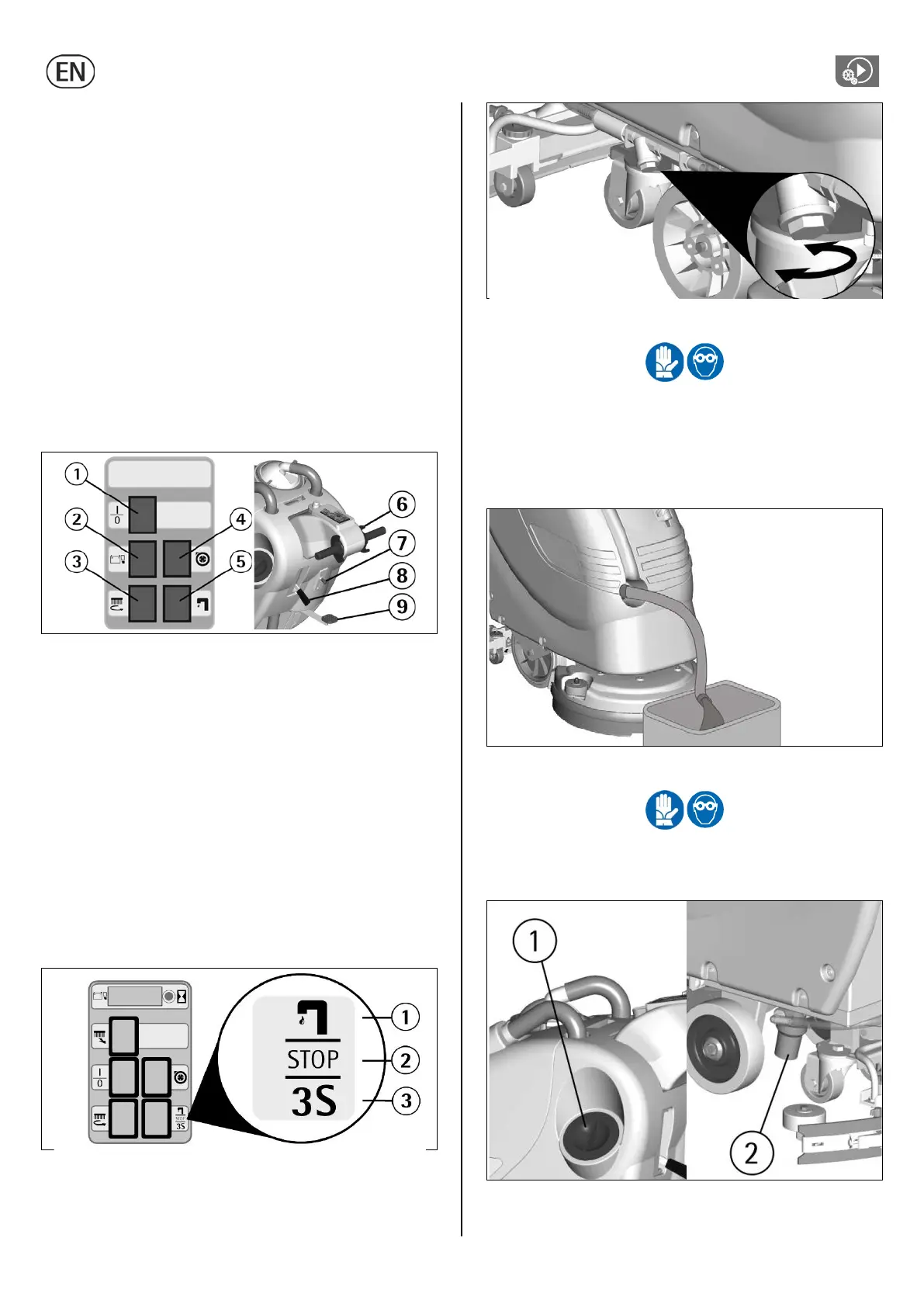 7. Acting upon the brush base lifting pedal (9) lower the brush