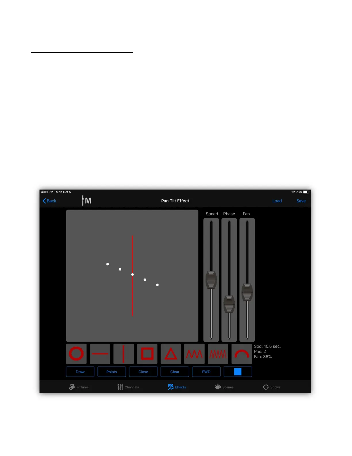 preset is selected and displayed in the shape draw area. It’s running five fixtures