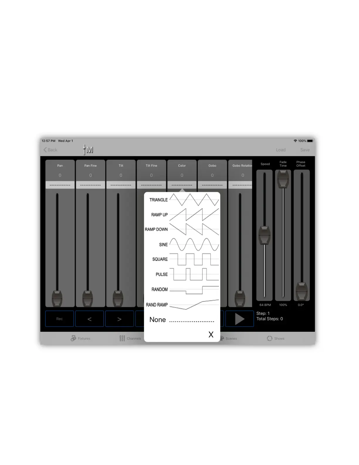 steps. Phase offset is the phase lag between fixtures shown in degrees from 0° to