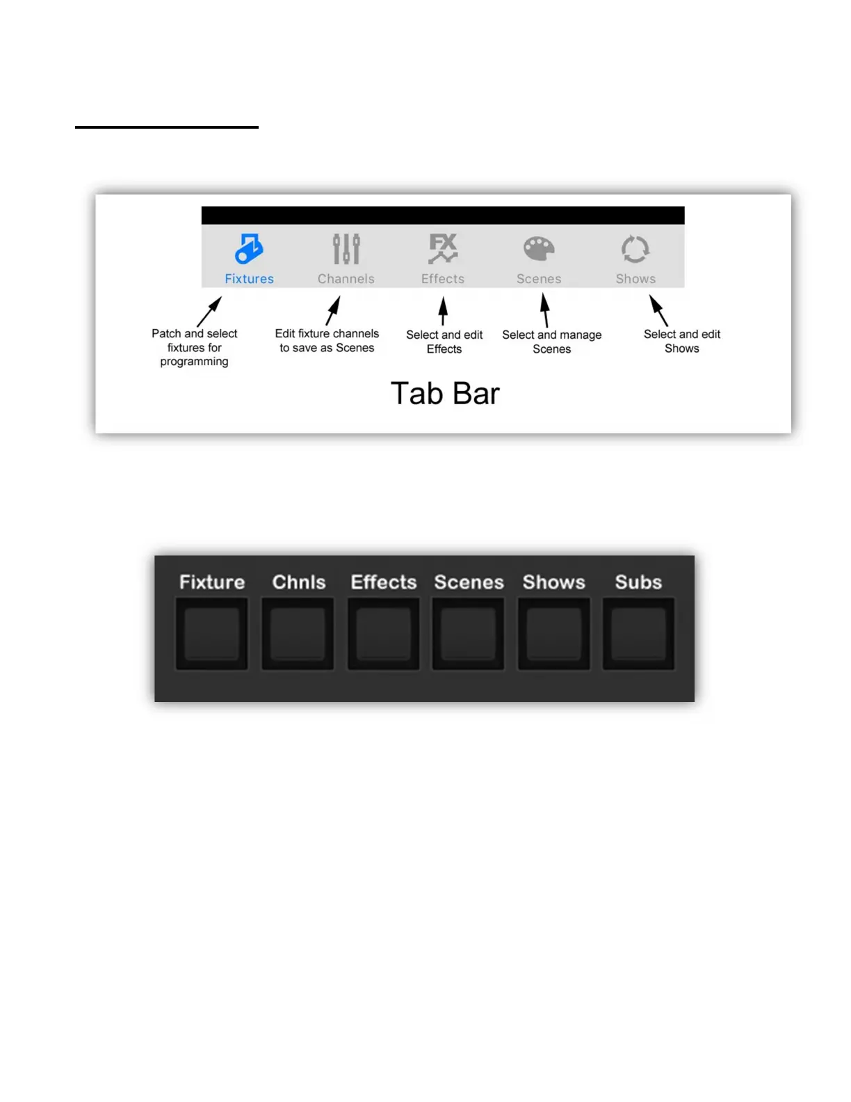 The tabs divide the app into five major sections of workflow. You can move from