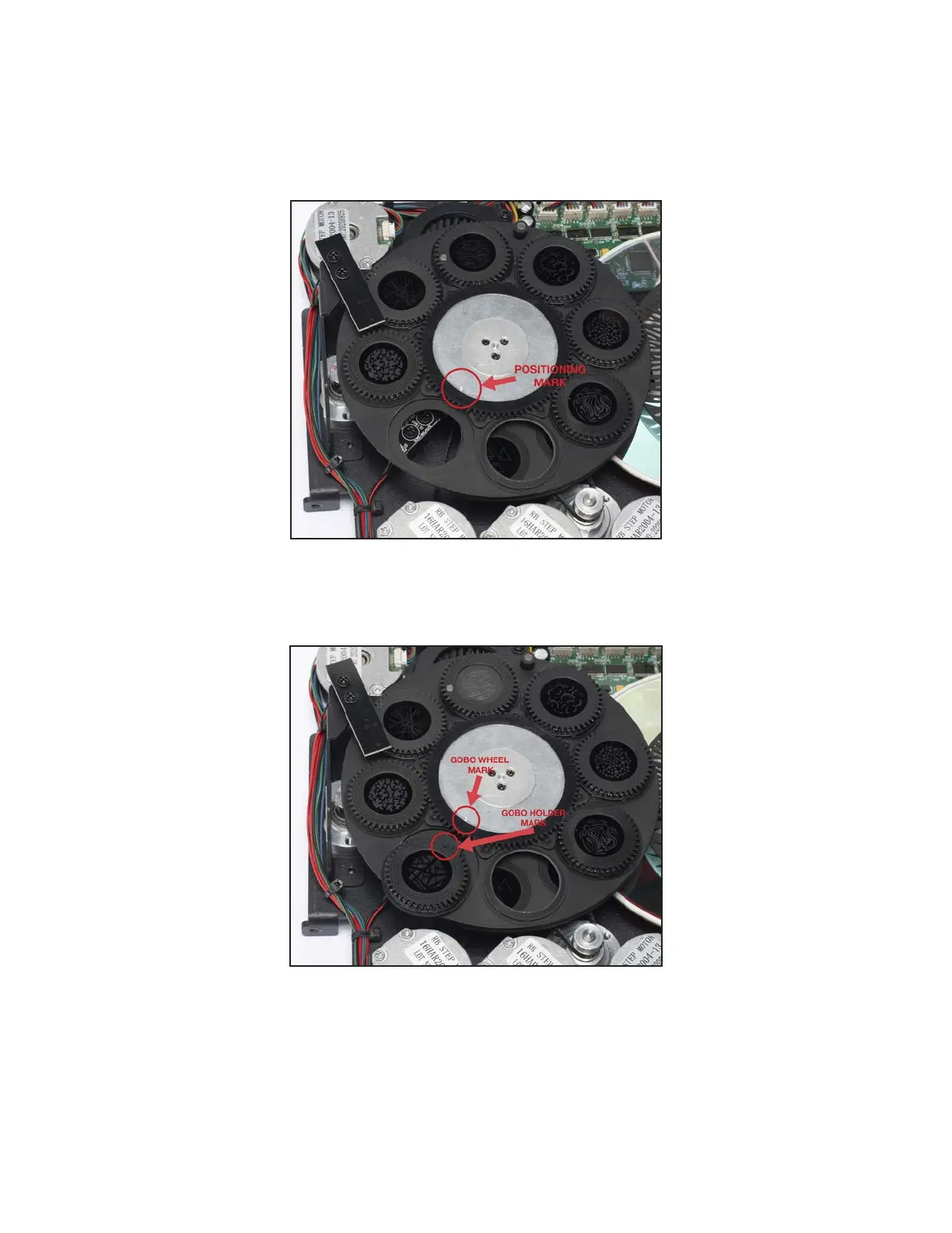 9. Manually rotate the silver central gear of the gobo wheel so that the positioning mark is aligned