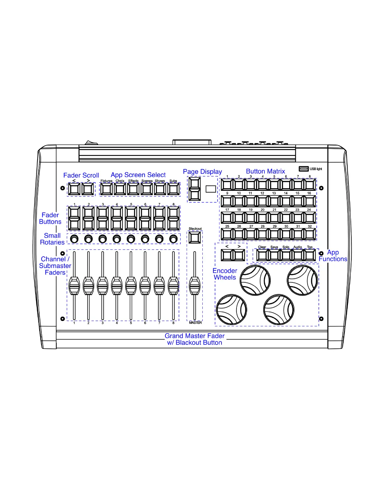 MASTER FADER and BLACKOUT BUTTON: Located in the center of the controller.