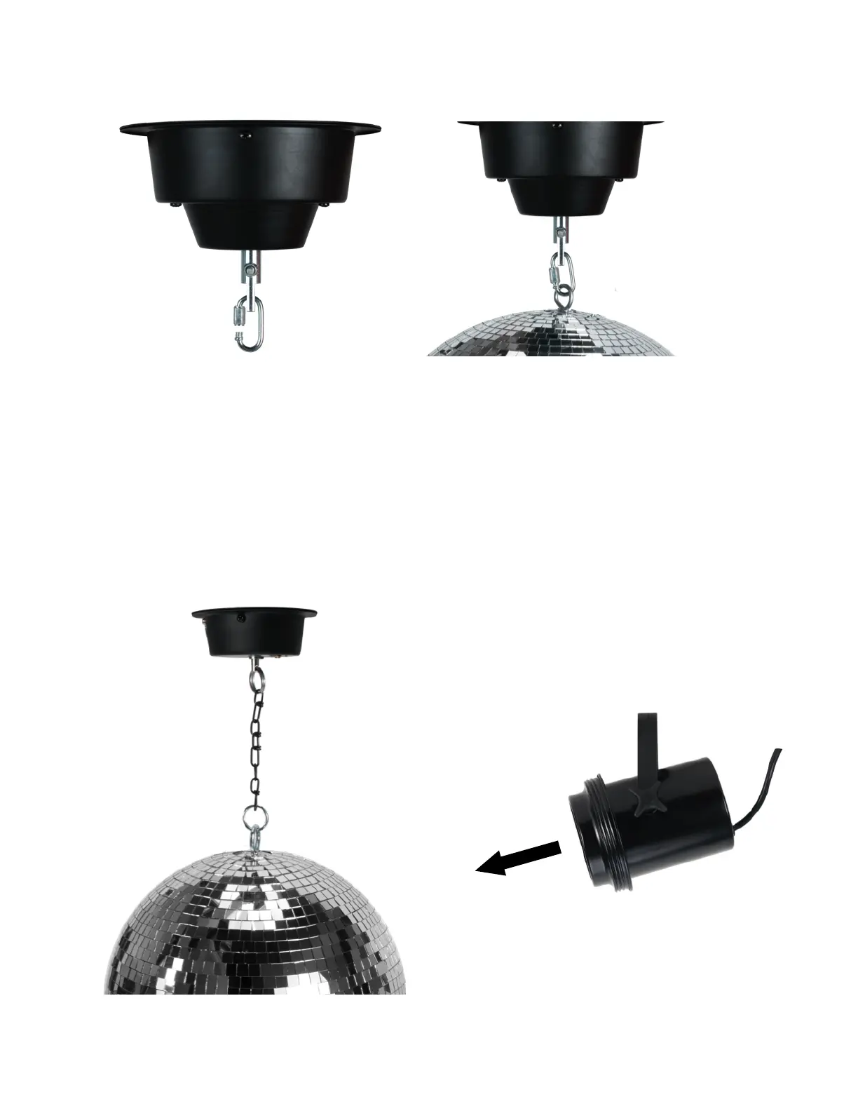 Attach mirror ball to fixture or motor axle using carabineer (not included) (make sure to close