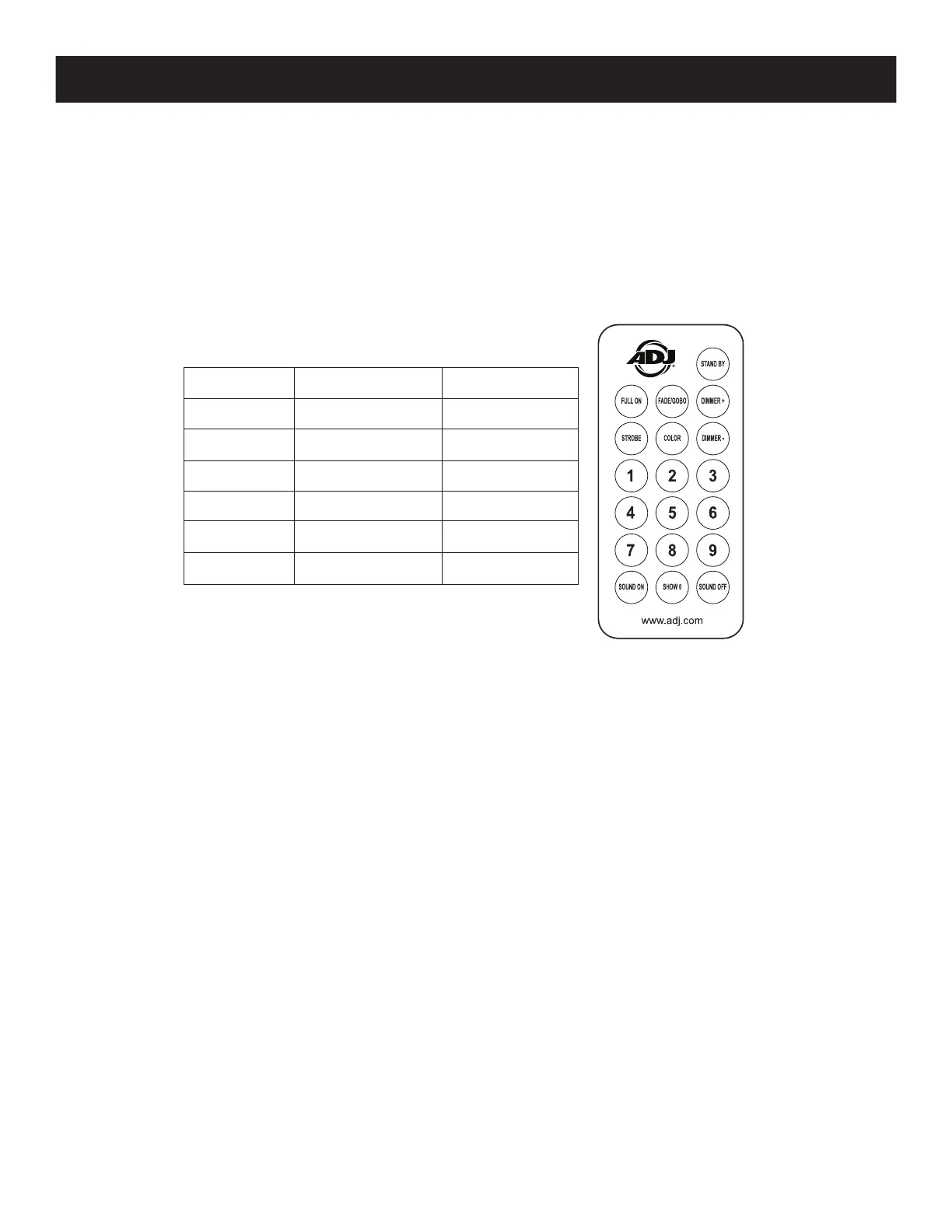 The ADJ UC IR (not included) infrared remote gives you control of various functions (See below).