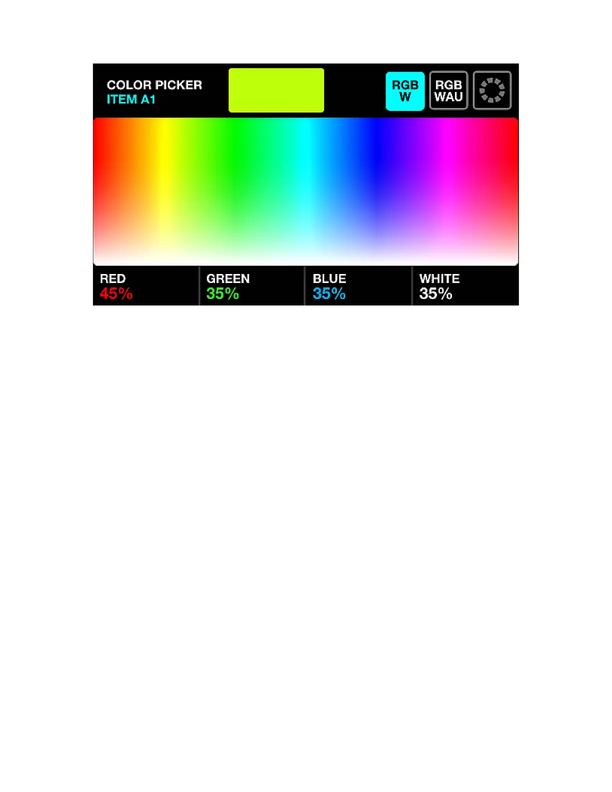 • Tapping and dragging on the color picker will set the RGBW values to the selected color.