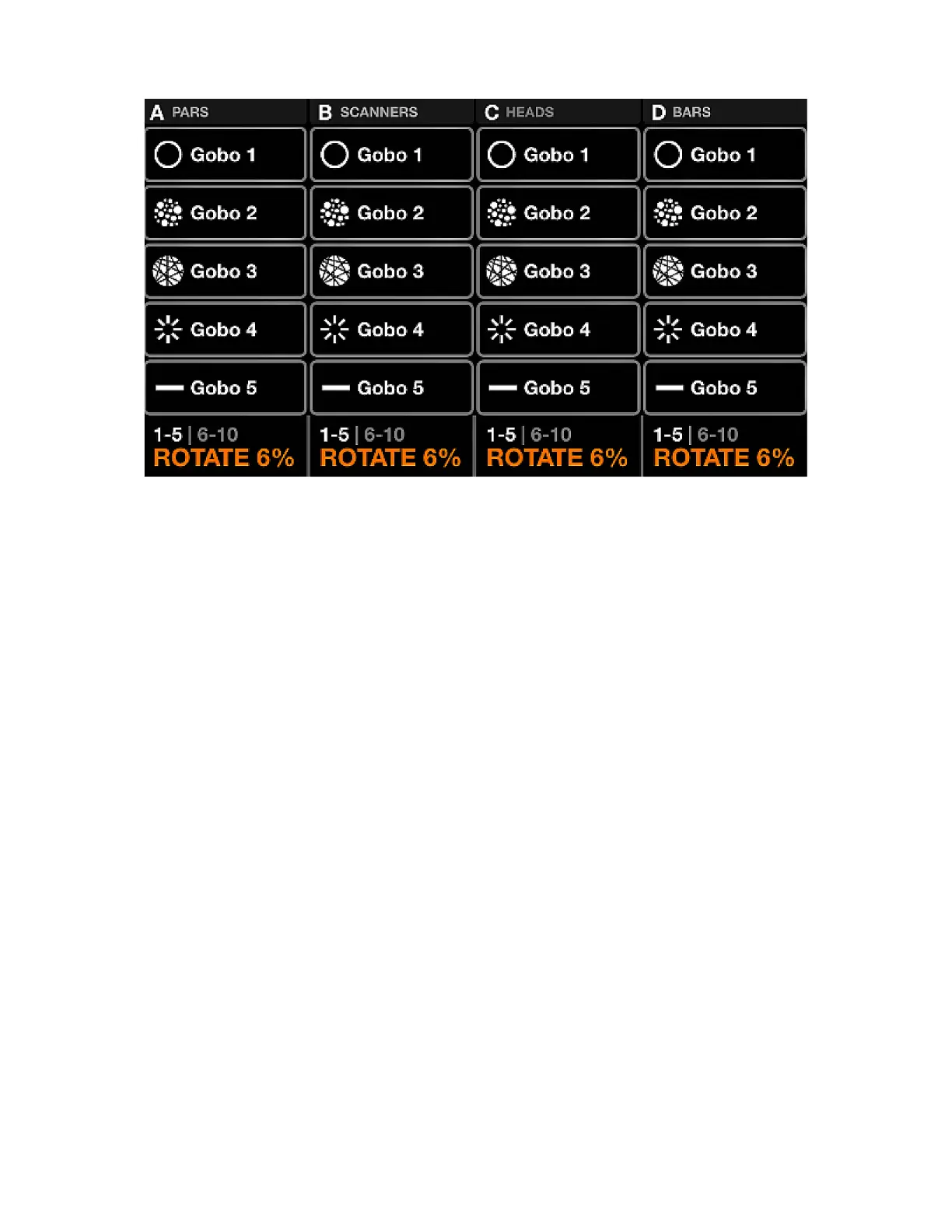 • Four columns containing ve gobos. Each column represents one group. Shift + hit the BPM TAP