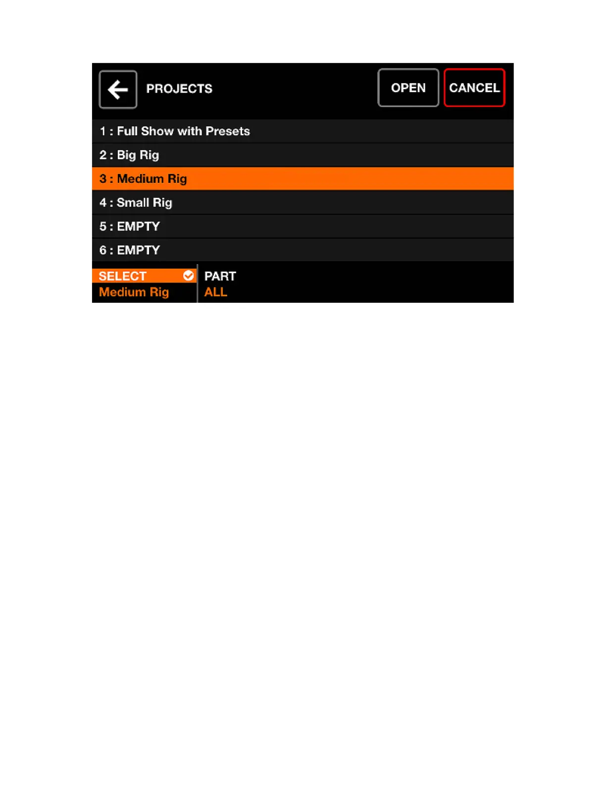 • Buttons to open or save a project into the selected slot.