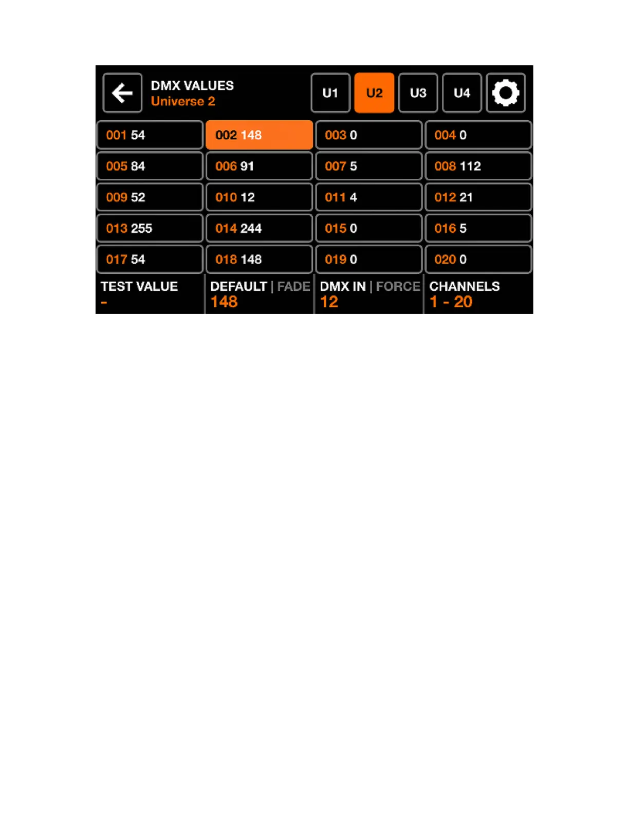 The DMX Values screen displays the current value of each DMX channel. It allows for the value to be