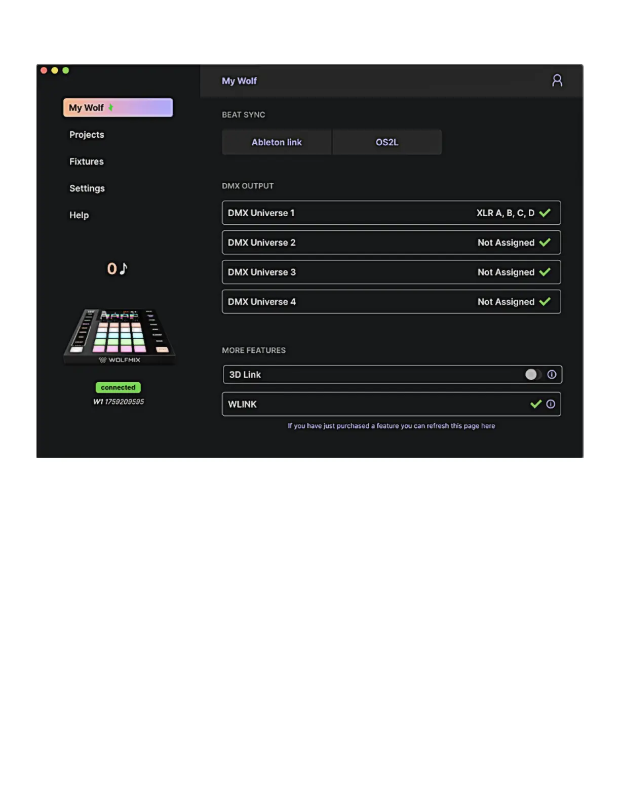• 3D link status: turn on to start relaying DMX from Wolfmix to Easy View 2 3D. Easy View can be