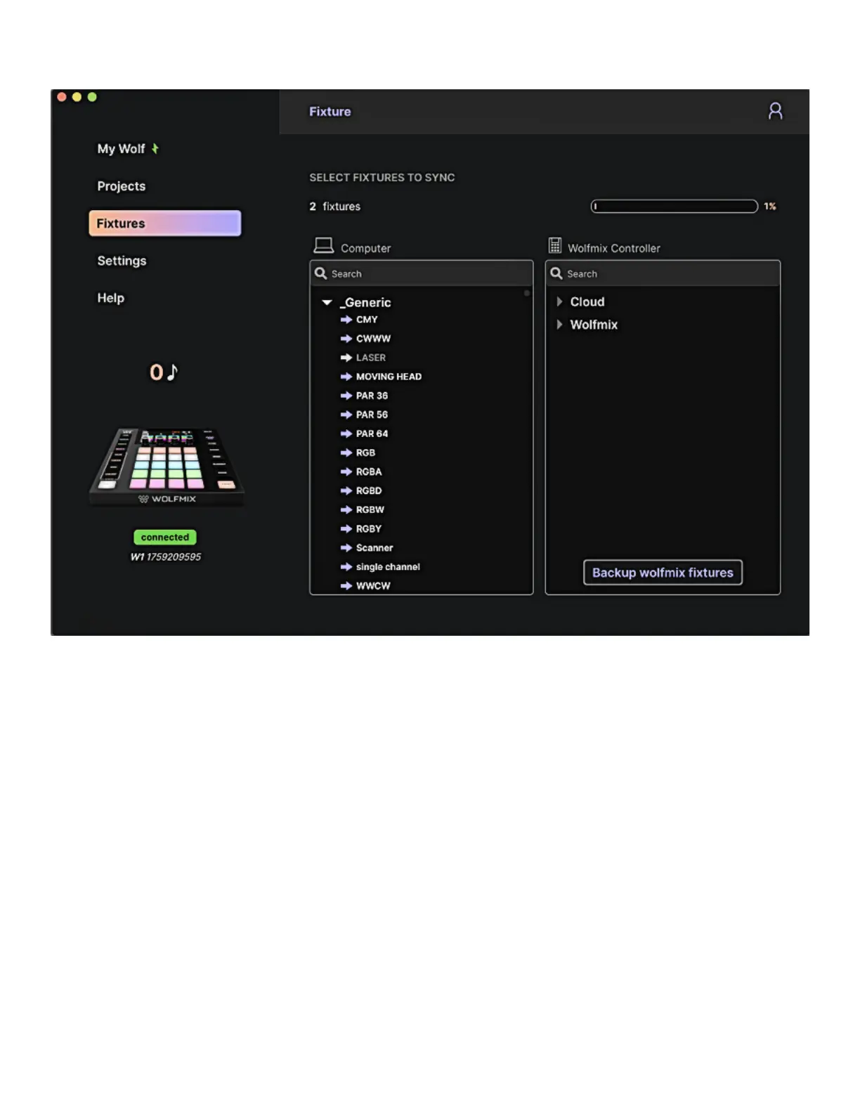 Fixtures on the computer and in the cloud are displayed on the left and xtures in the Wolfmix controller