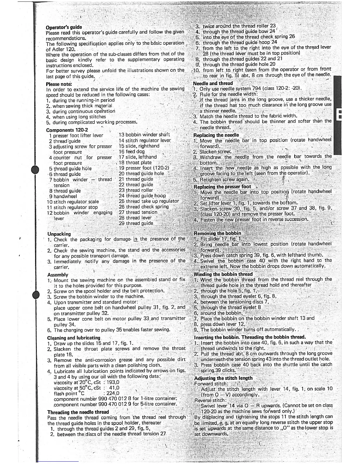 Adler 120 - Adler 120 Operators Guide; Machine Components Identification; Unpacking and Initial Assembly; Threading and Bobbin Operations
