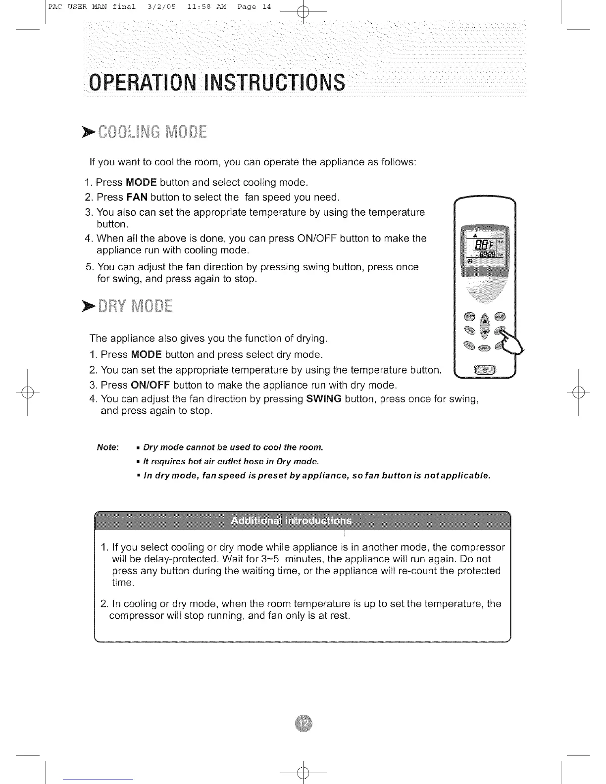 1. If you select cooling or dry mode while appliance is in another mode, the compressor