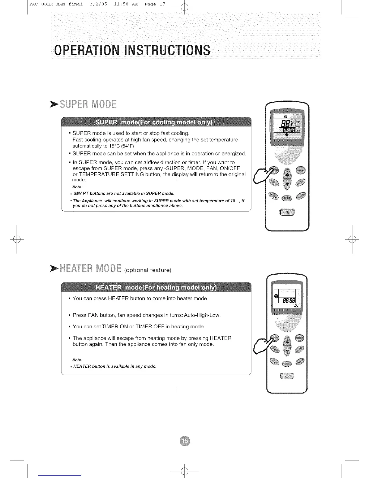 • The Appliance will continue working in SUPER mode with set temperature of 18 , if