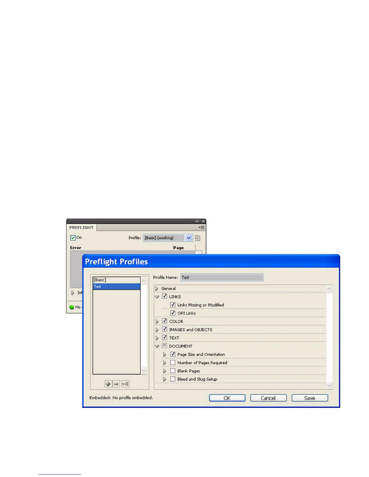 To create a preflight profile from the Preflight panel, choose Preflight Panel > Define Profiles, then choose