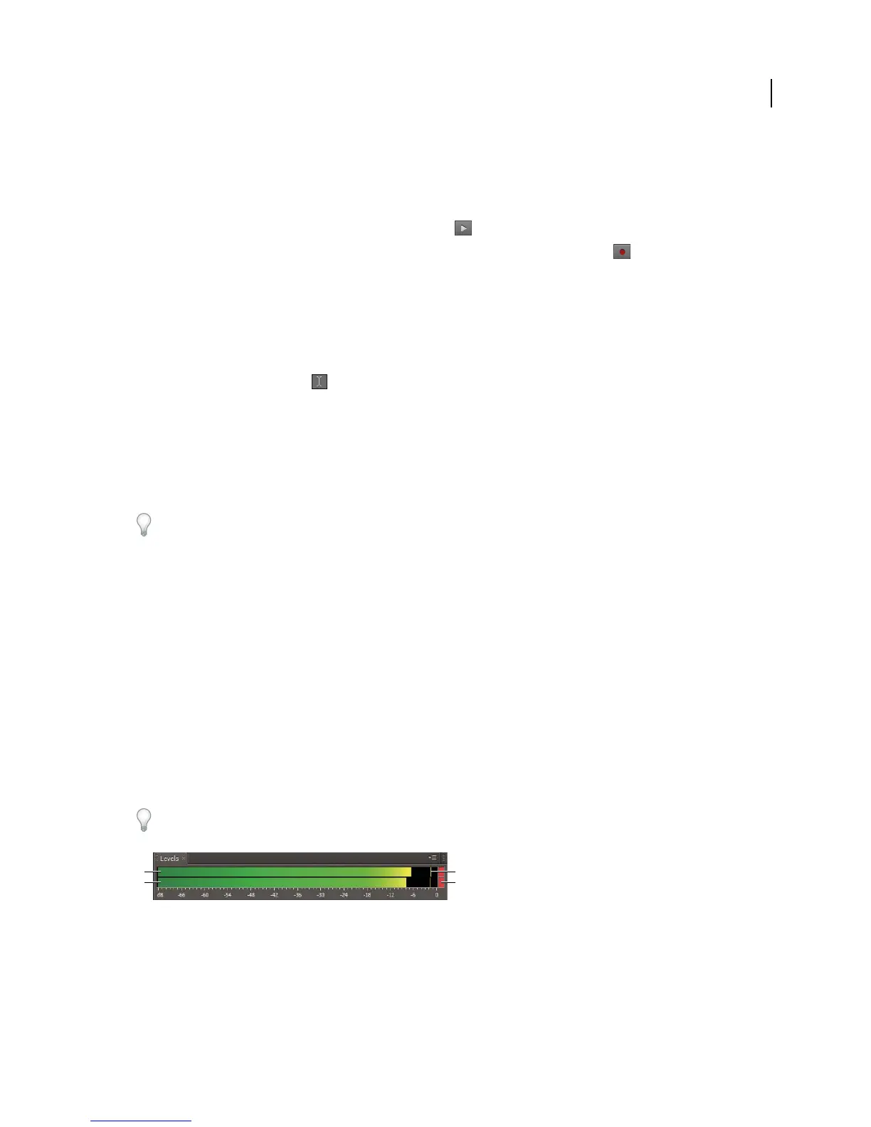 Levels panel, which shows the amplitude of the Master output, and track meters, which show the amplitude of