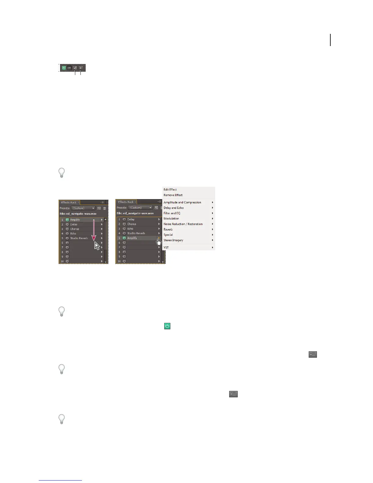 • To bypass a selected group of effects, choose Toggle Power State of Selected Effects from the panel menu .