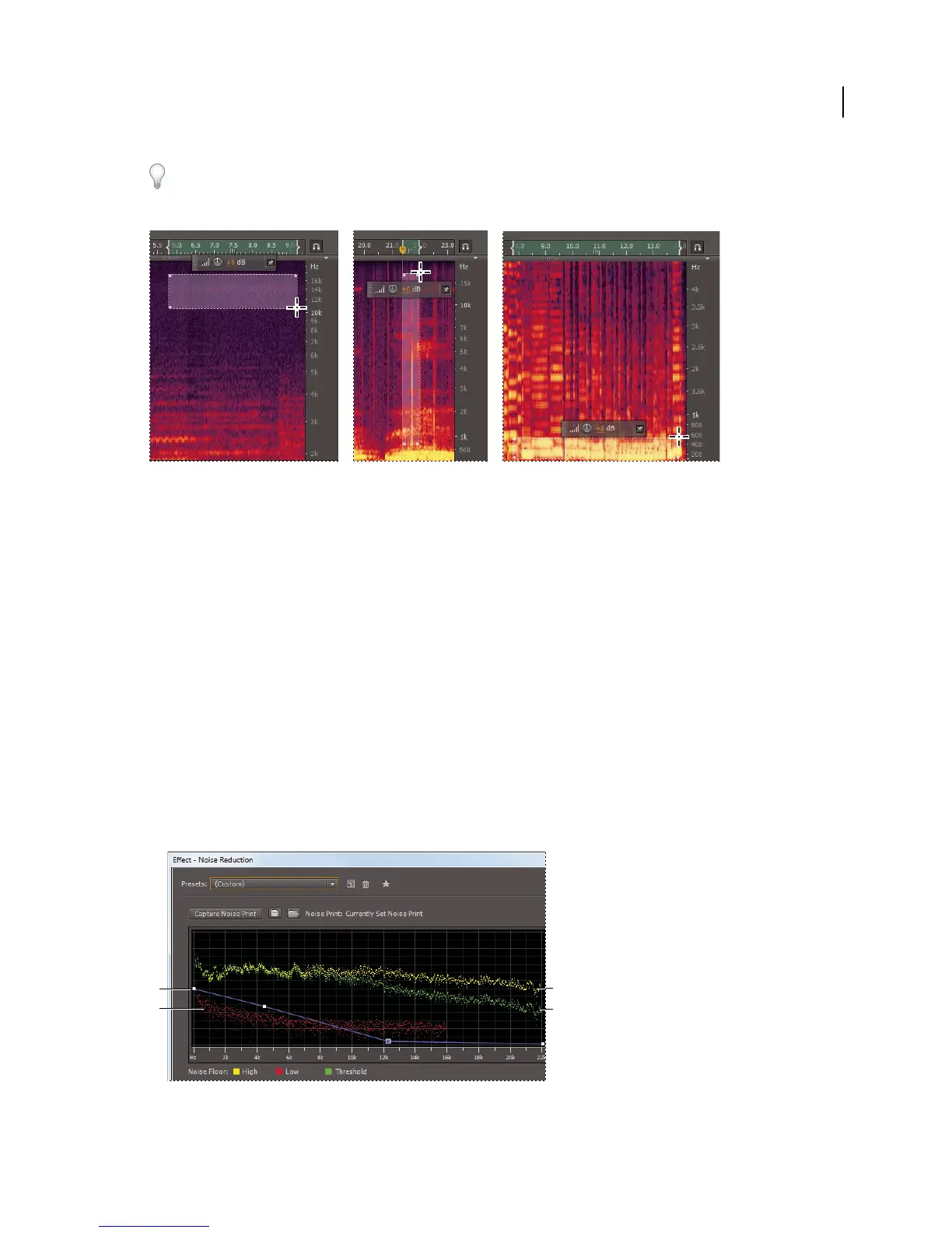 A. Drag control points to vary reduction in different frequency ranges B. Low amplitude noise. C. High amplitude noise D. Threshold below
