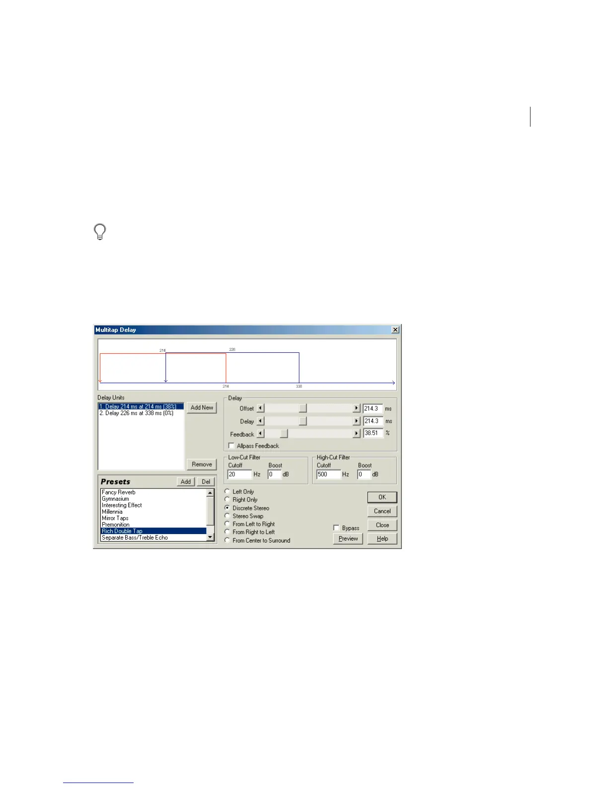 Multitap Delay can be described as a combination of Delay, Echo, Filter, and Reverb effects. Up to 10 delay units can be
