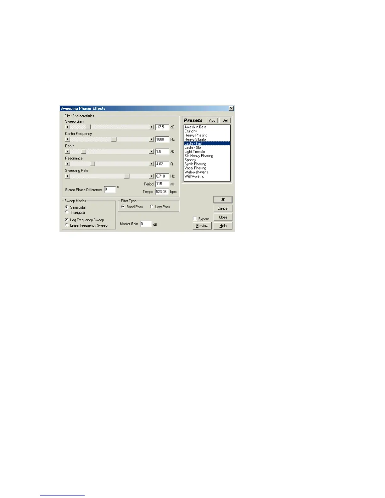 Depth This setting determines the degree of phasing. The value is given as a Q value, which is a ratio of width to center