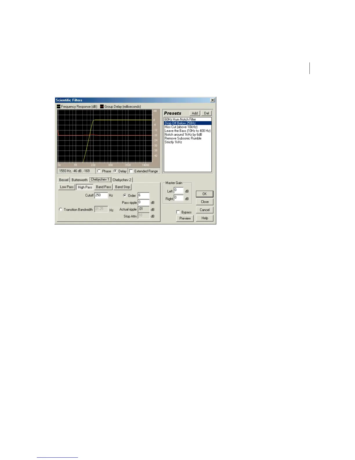 The four most common types of higher order filters are available: Bessel, Butterworth, Chebychev 1, and Chebychev 2.