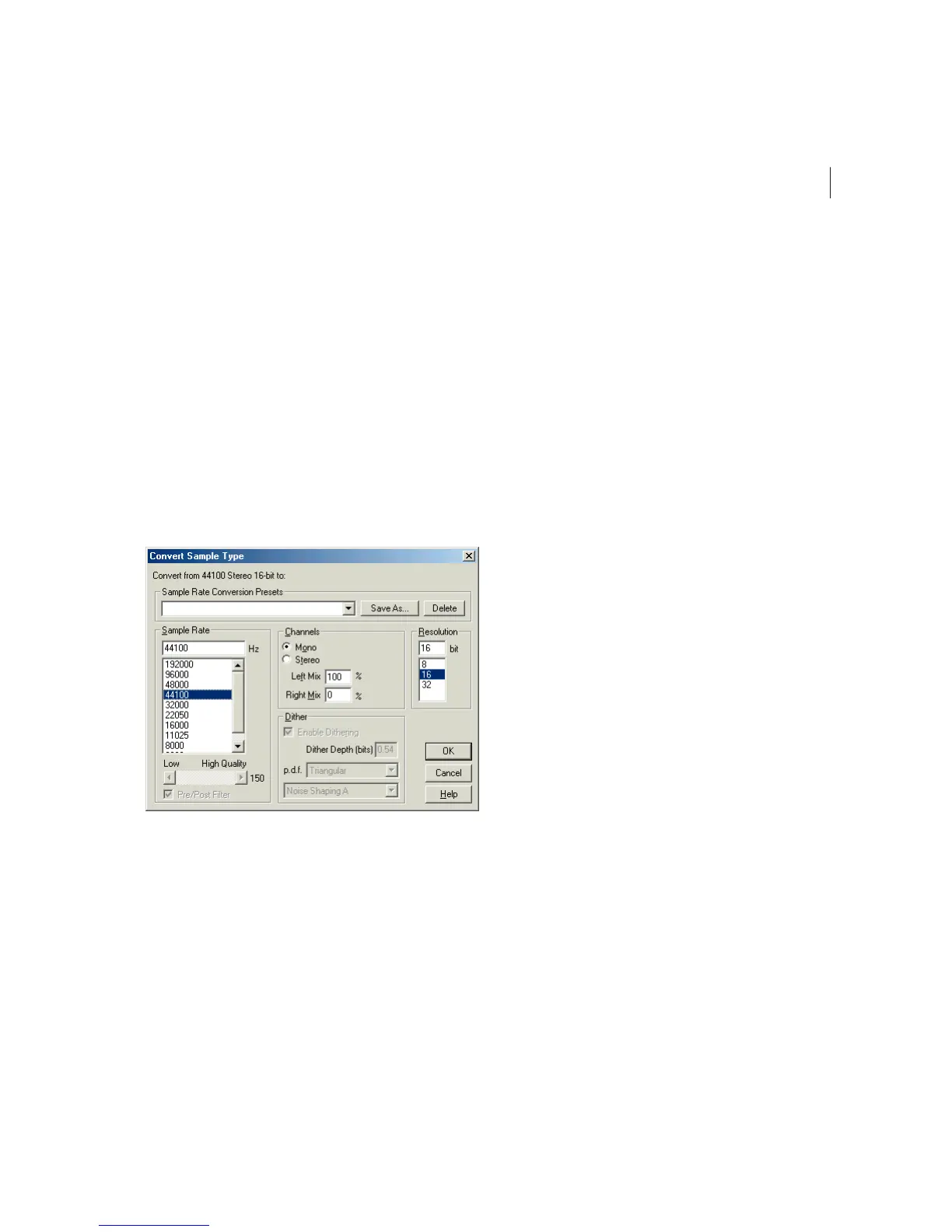 when converting between mono and stereo formats. The Dither option allows you to reduce granulation noise when