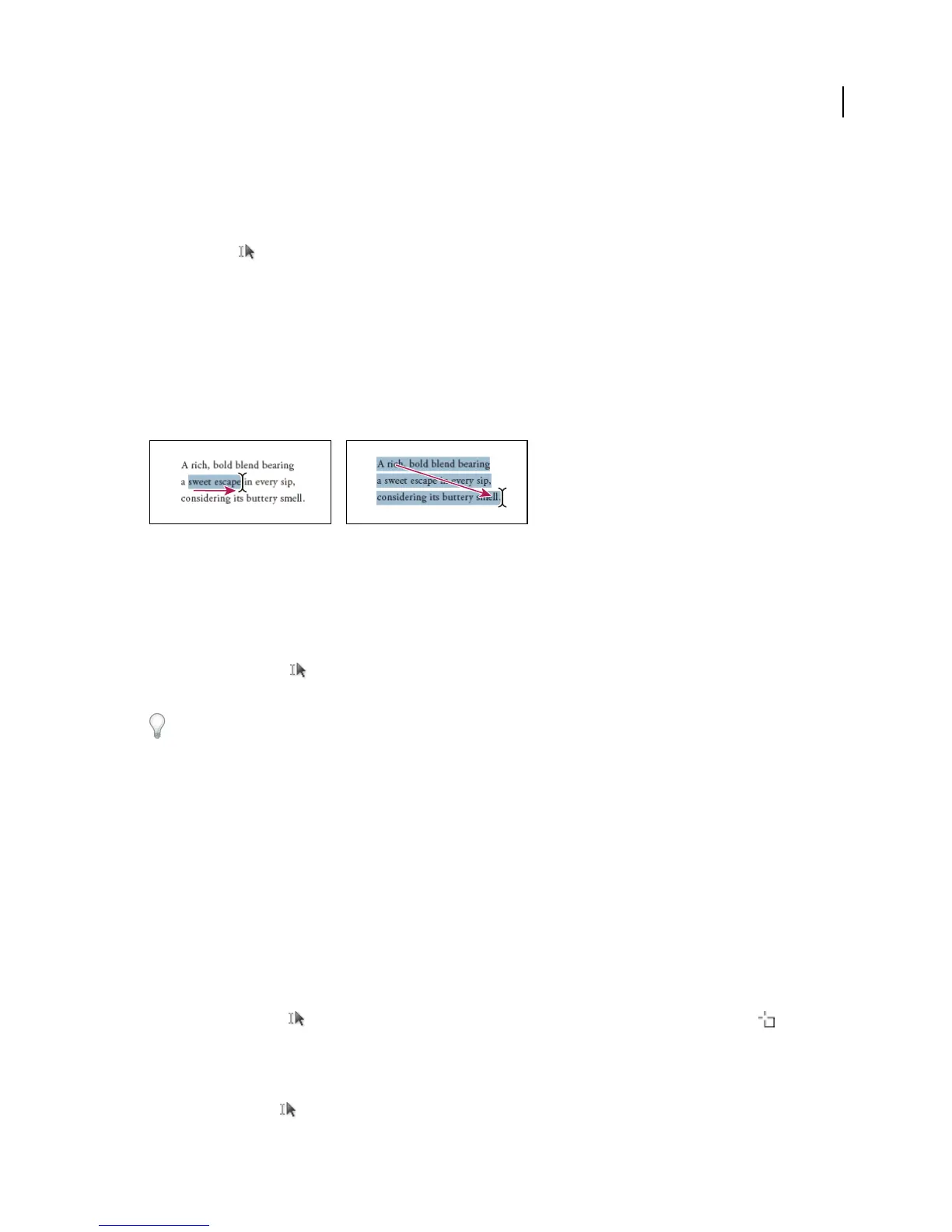 Select text by dragging from an insertion point to an end point (left) or by dragging diagonally over text (right).