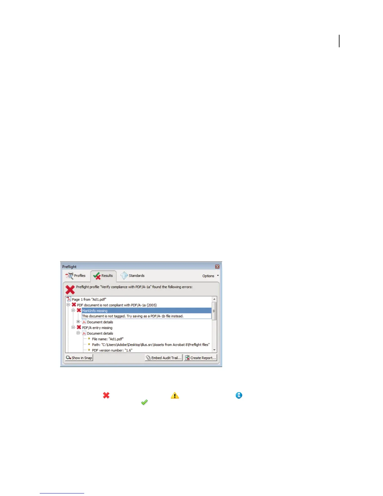 information. An alert icon appears next to each check that did not meet the criteria specified in the preflight profile.