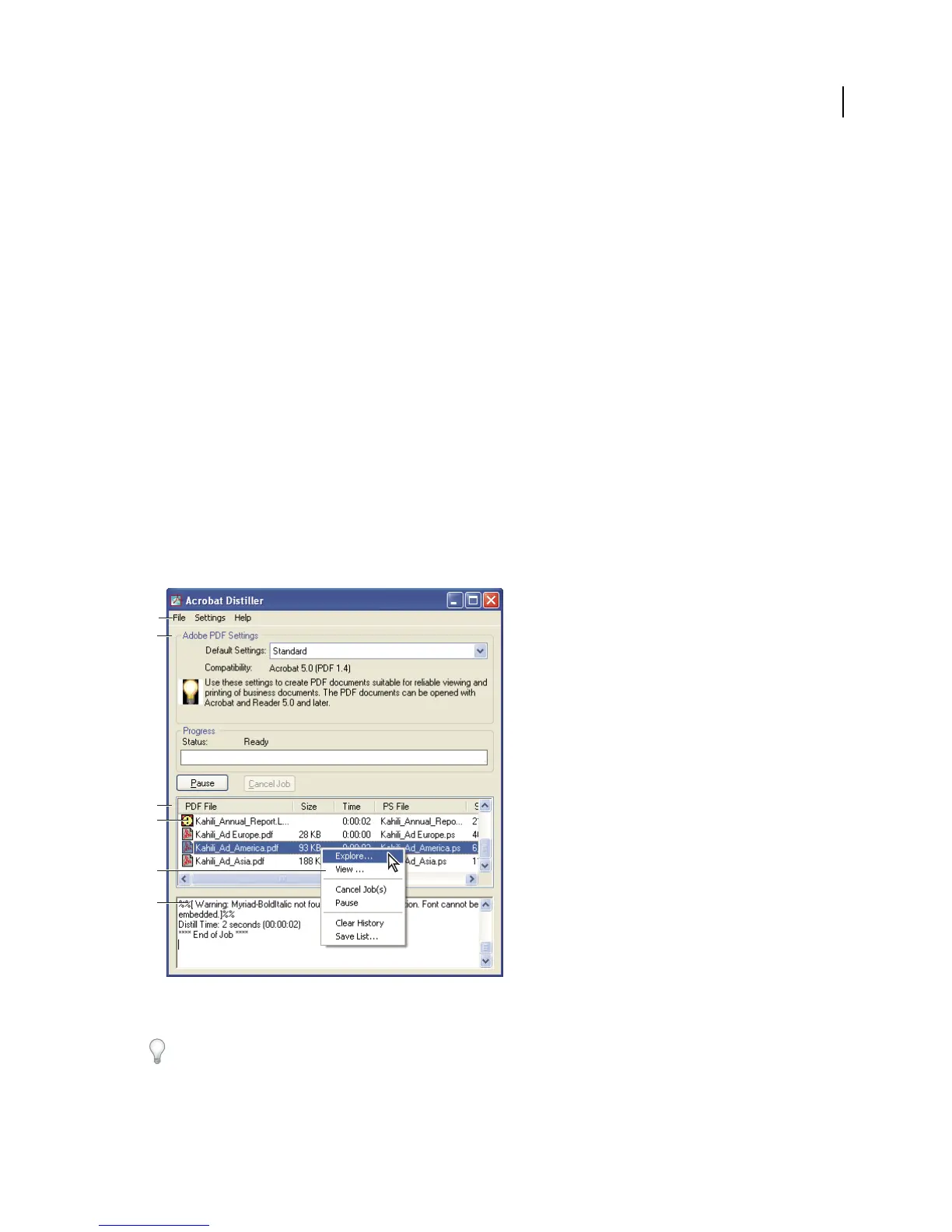 information. You also use the Acrobat Distiller window to monitor the jobs you’ve lined up for PDF conversion.