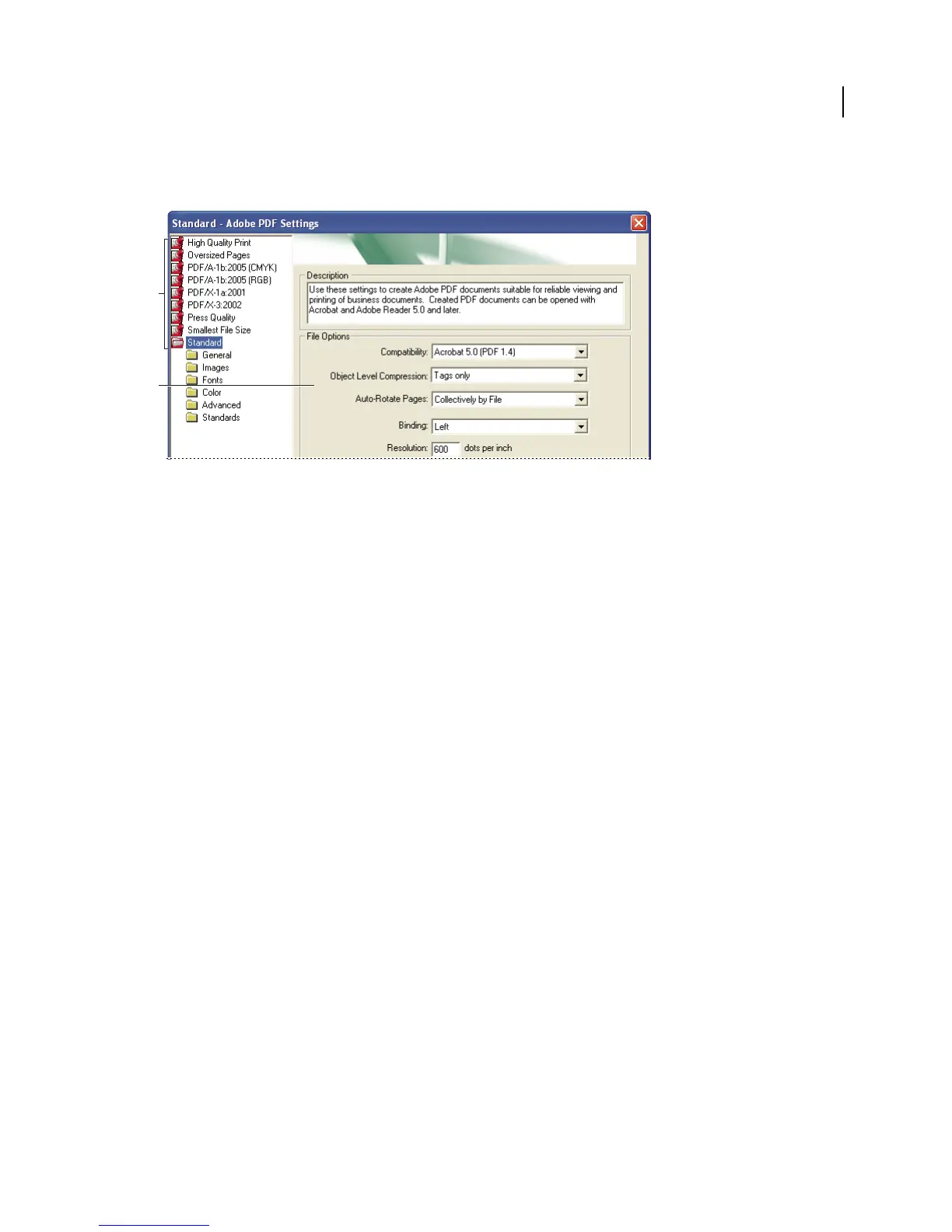 A. Predefined Adobe PDF settings B. Options panel