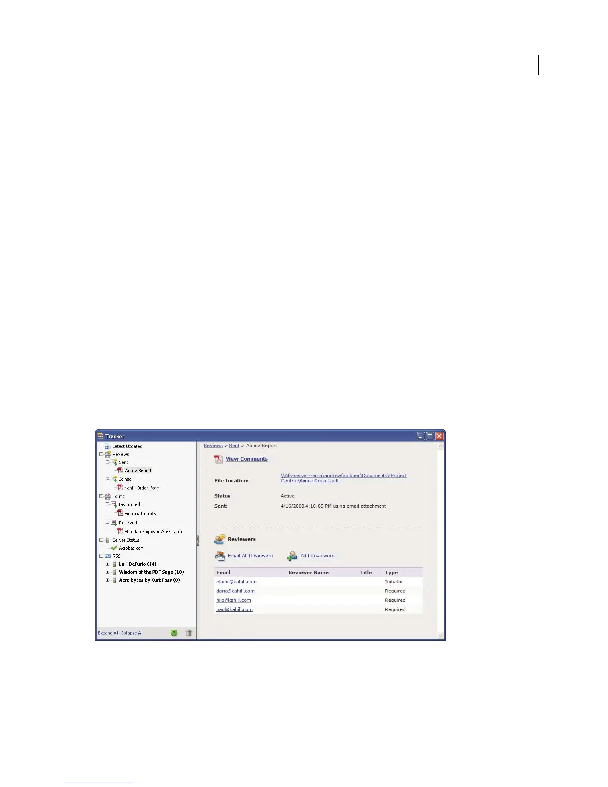 manage web broadcast subscriptions (known as RSS feeds). To open the Tracker from Acrobat, choose Comments >