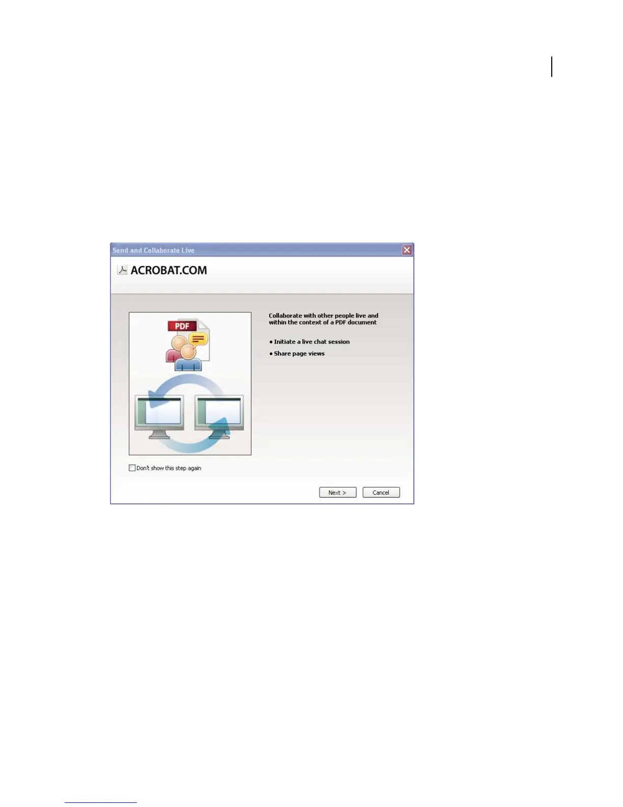 Choose File > Collaborate > Send & Collaborate Live. Log on to Acrobat.com, if prompted. If you don’t have an