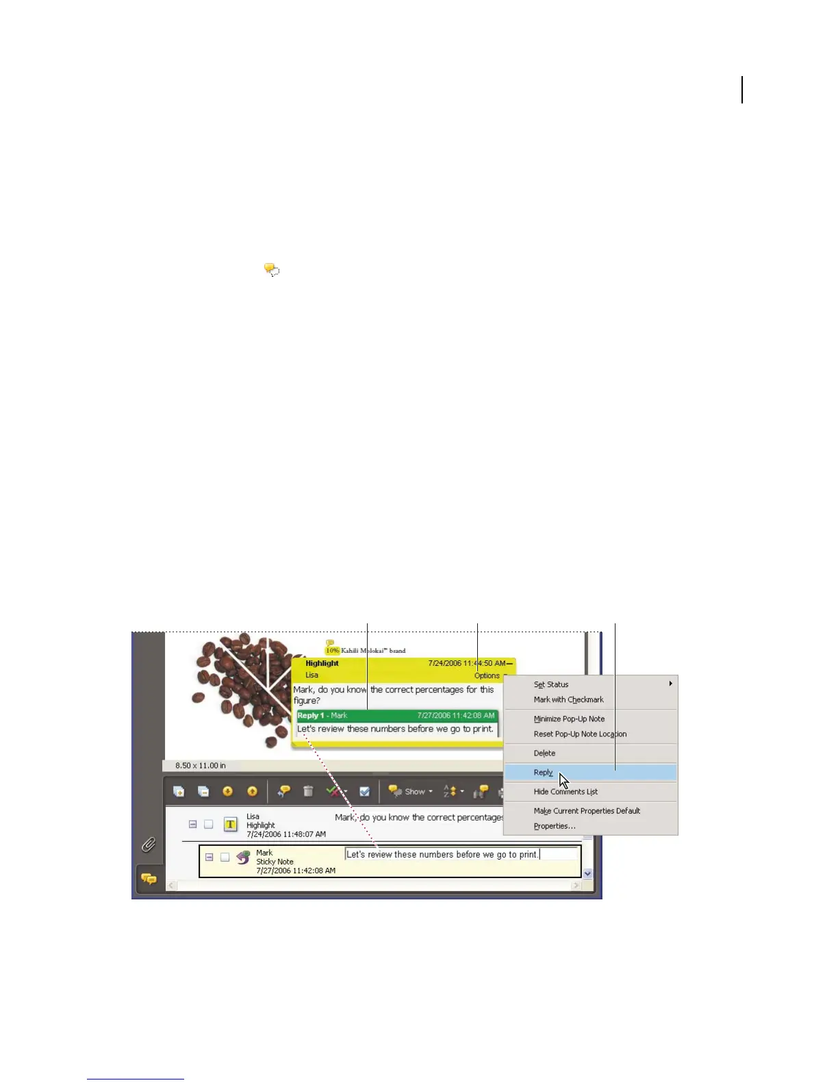 more reviewers reply to a comment, the set of replies is called a thread. All replies in a thread appear in the pop-up