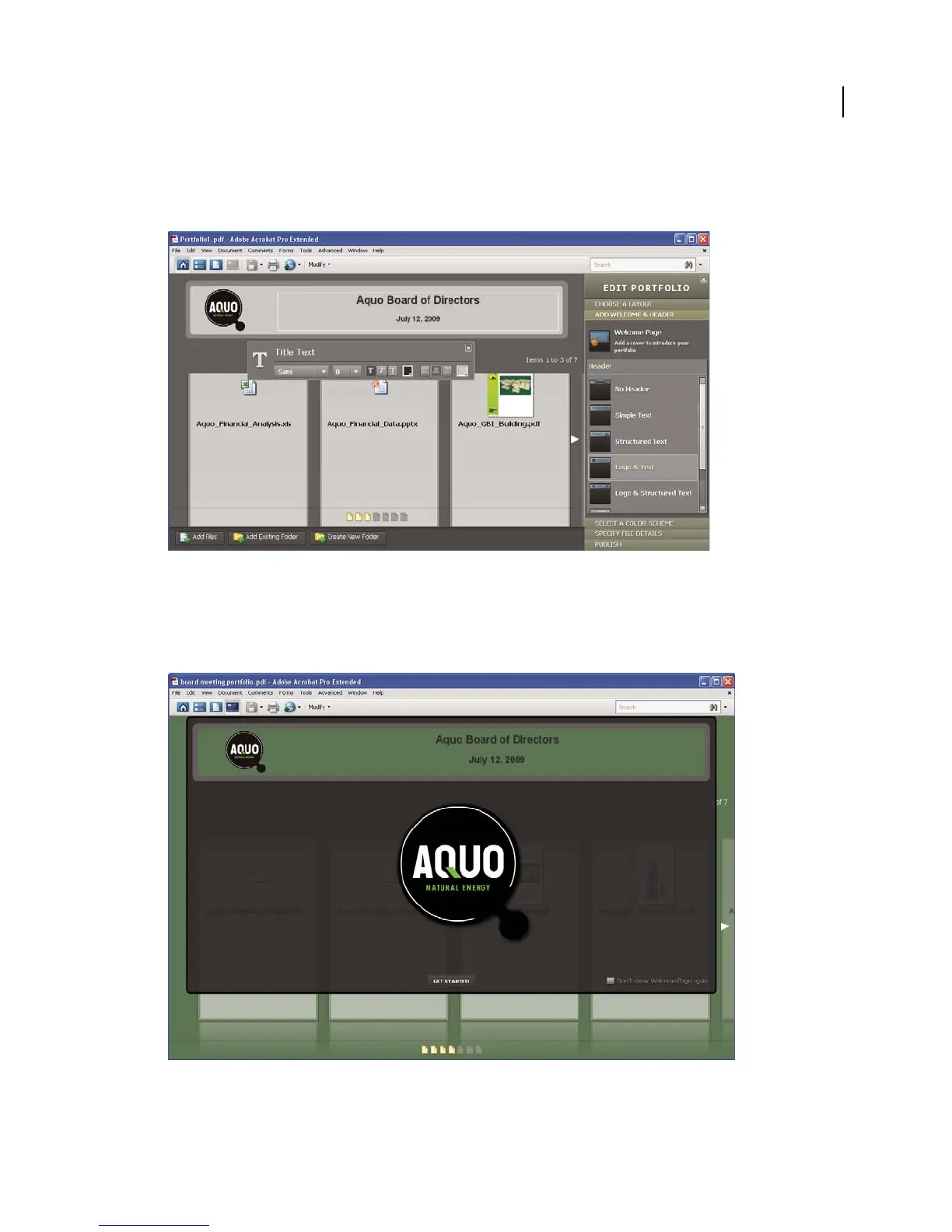 A welcome page appears when the PDF Portfolio is opened. A welcome page can include text, images, or a Flash