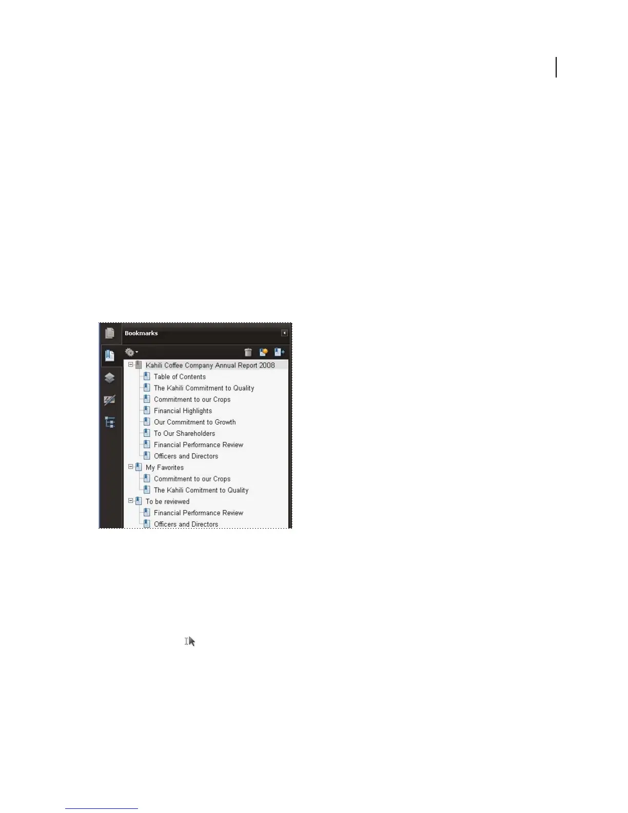 in the PDF, another document, or a web page. Bookmarks can also perform actions, such as executing a menu item or