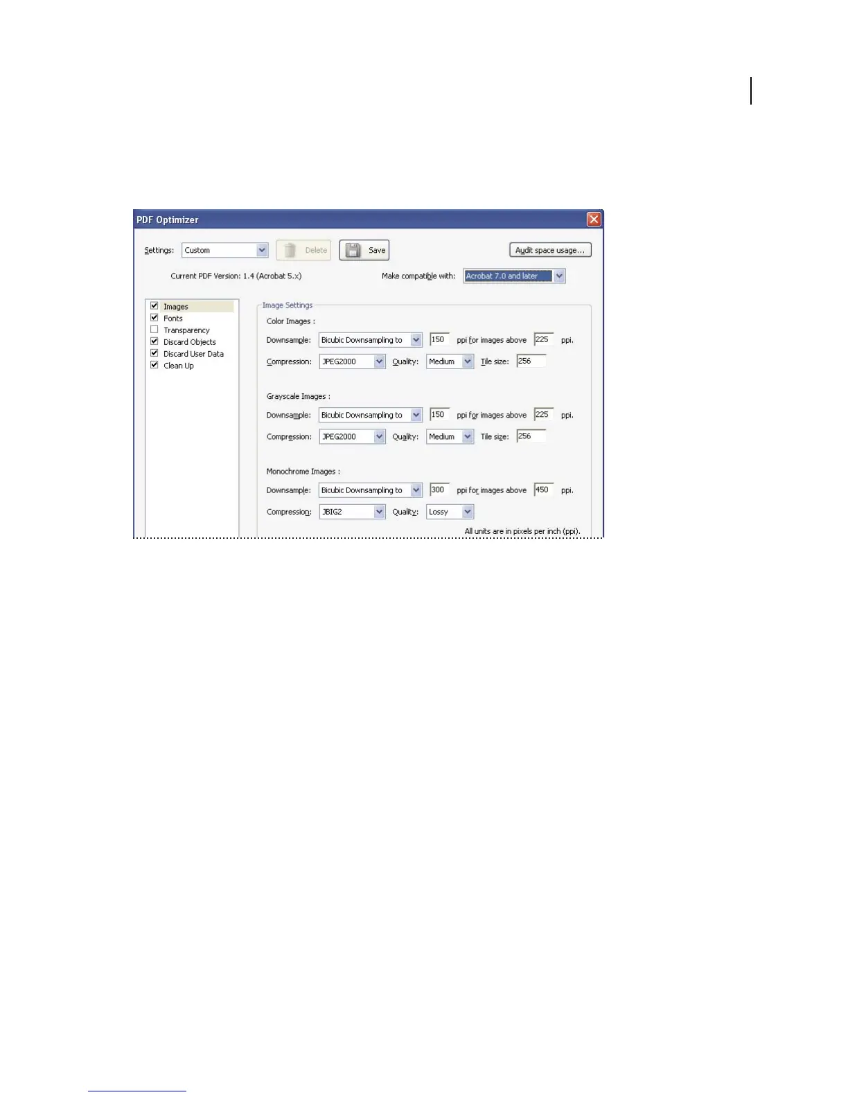The Images panel of the PDF Optimizer lets you set options for color, grayscale, and monochrome image compression,