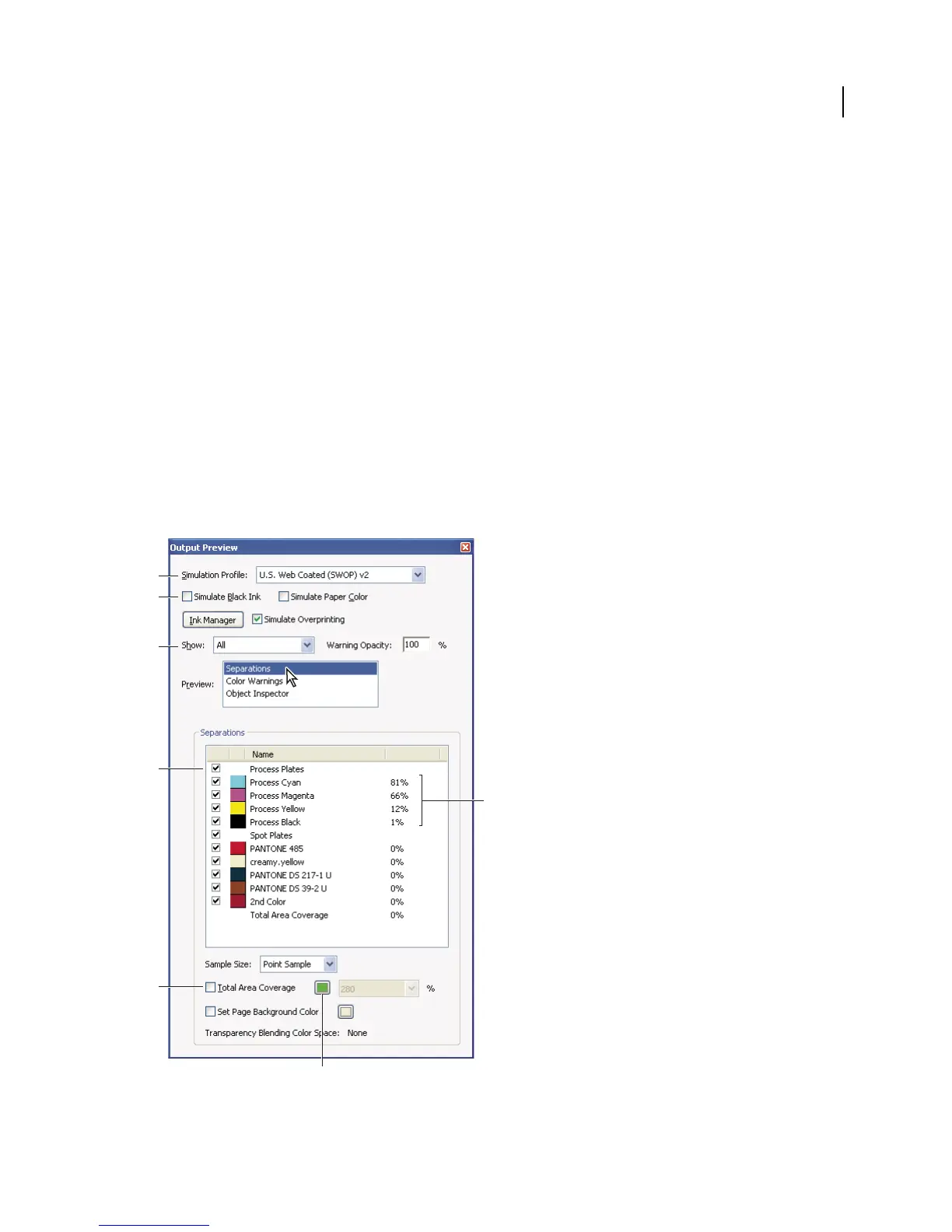 separations and previewing color warnings. When you select Separations, the bottom half of the dialog box lists