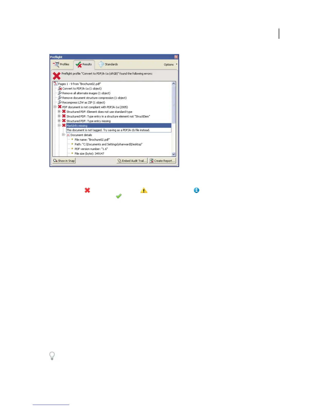 • If you switched to a different view in the Preflight dialog box, click Results to get back to the Results list.