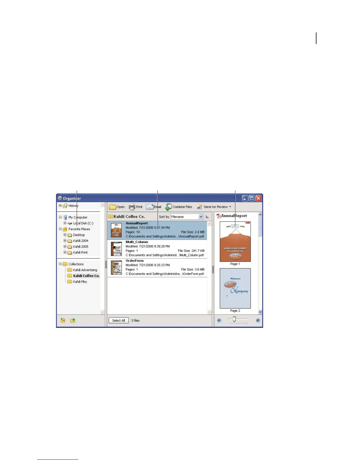 favorites. With Organizer, you can see thumbnail images of PDF pages to quickly identify files. Use Organizer to