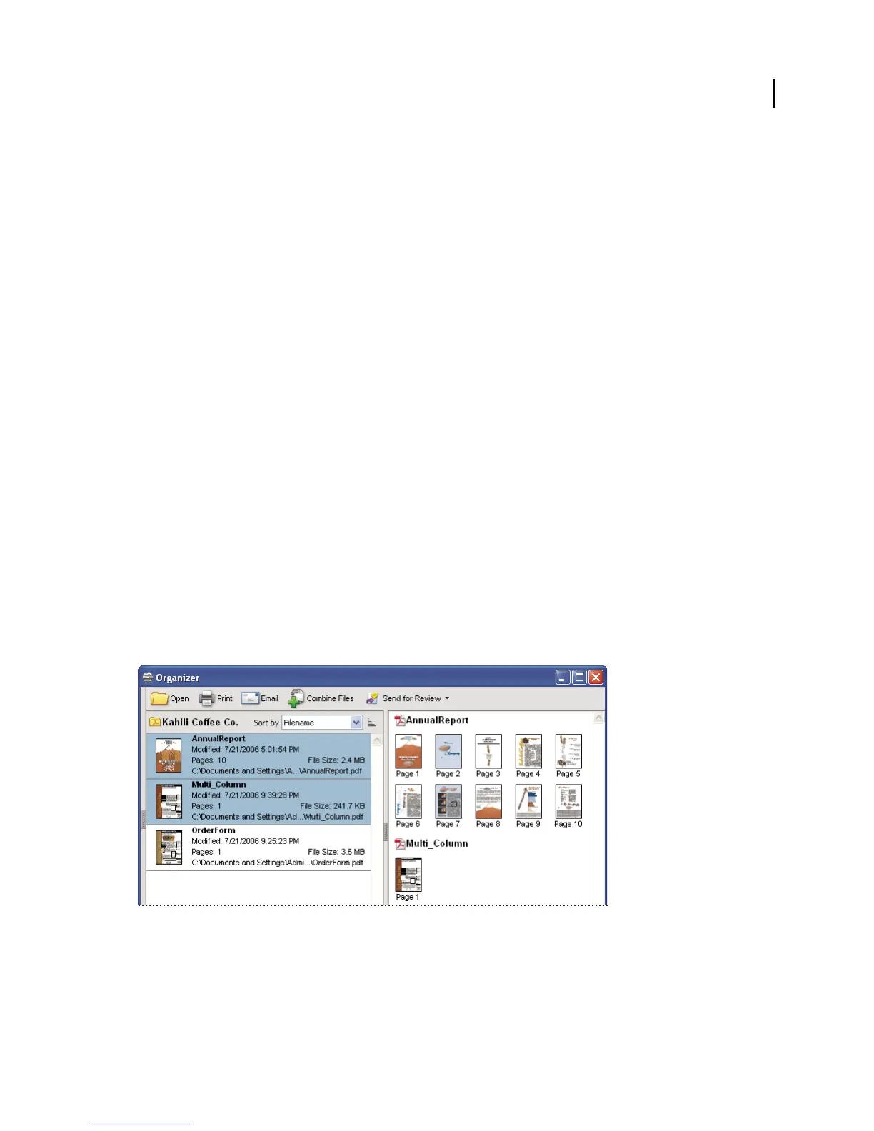The pages pane of the Organizer window displays thumbnails for every page of all PDF files that are selected in the files