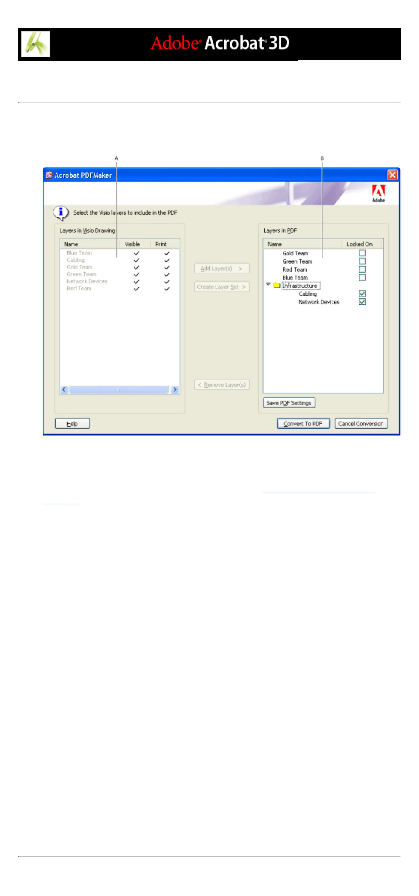 Visio layers to convert A. Layers in the Visio file B. Visio layers to convert to PDF layers