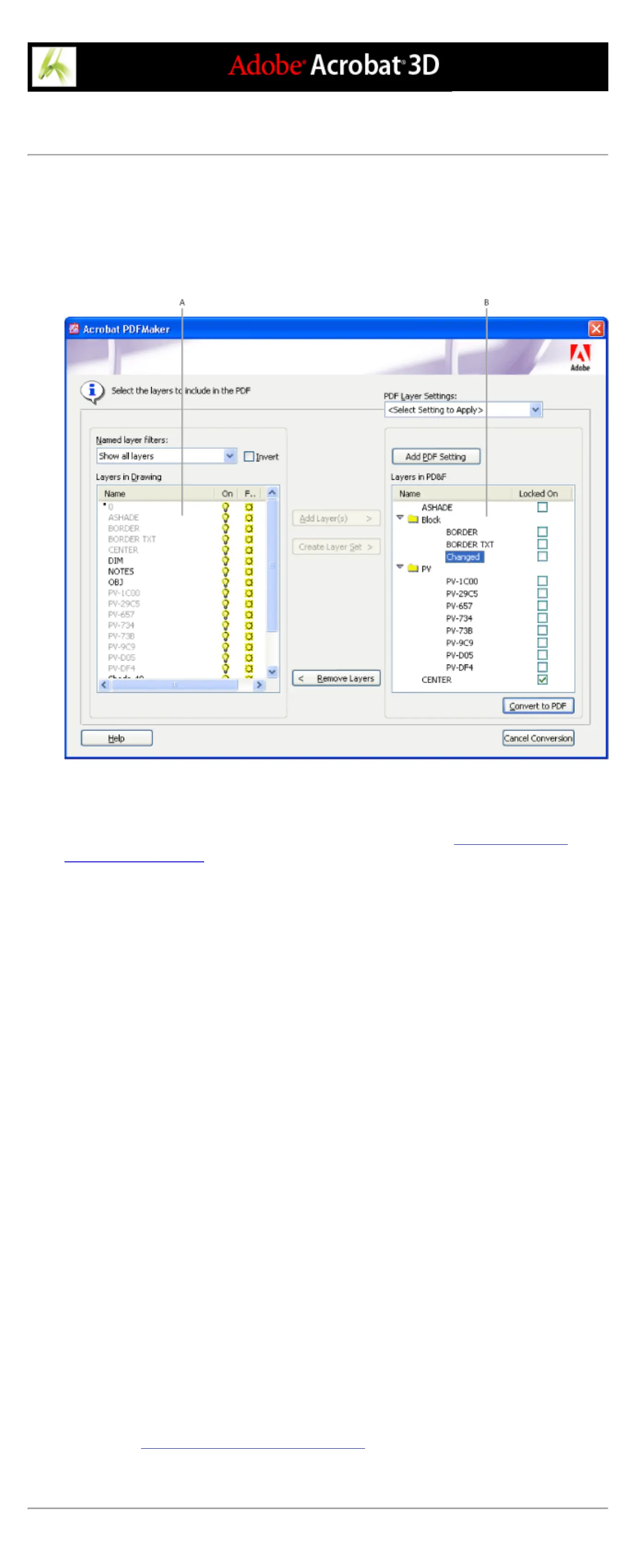 To select AutoCAD layers to convert to Adobe PDF layers: