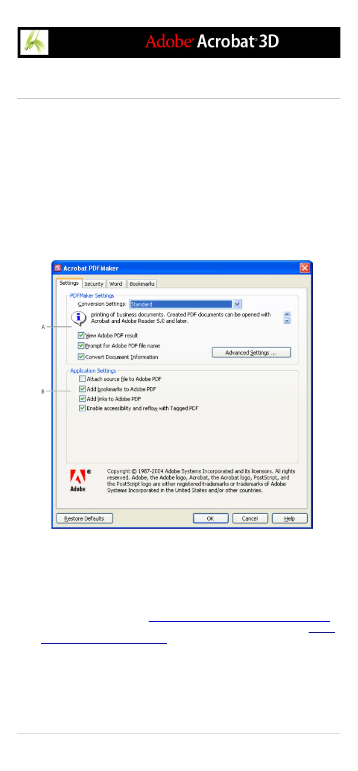 PDFMaker dialog box. To display the PDF conversion settings, choose Adobe PDF >