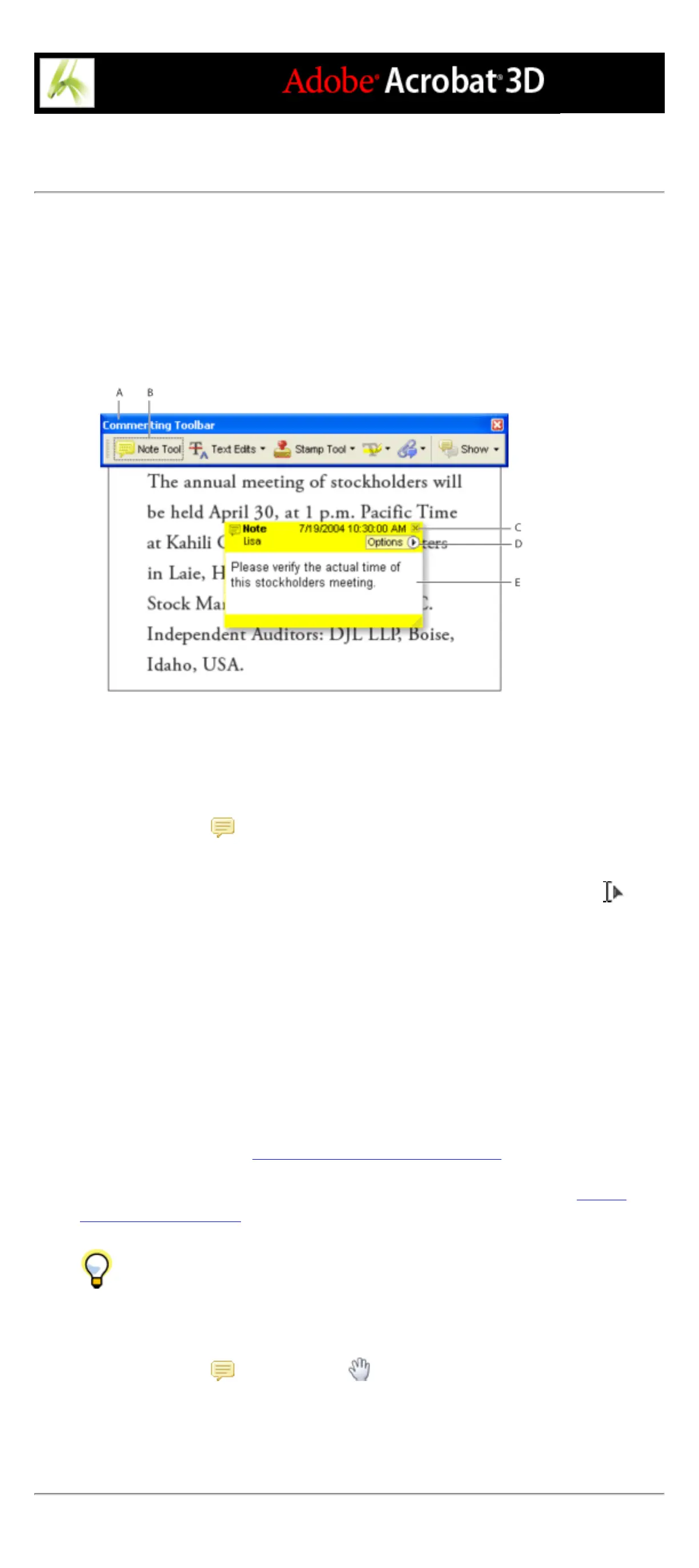 Use the Note tool to apply a note comment with a pop-up window. A. Commenting toolbar B.