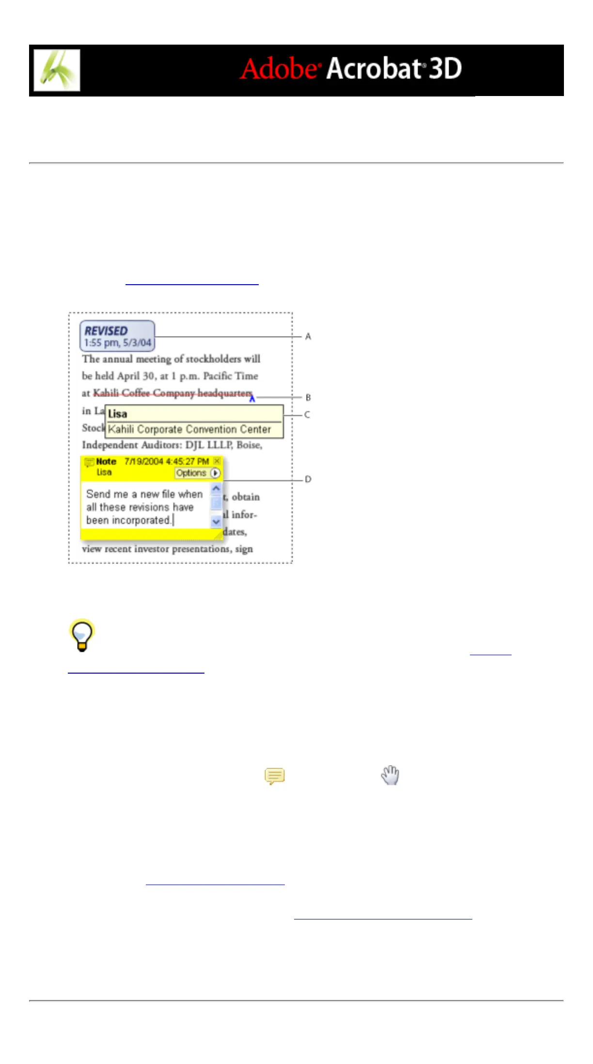 Comments in a PDF document A. Stamp B. Text edit C. Comment rollover D. Note pop-up