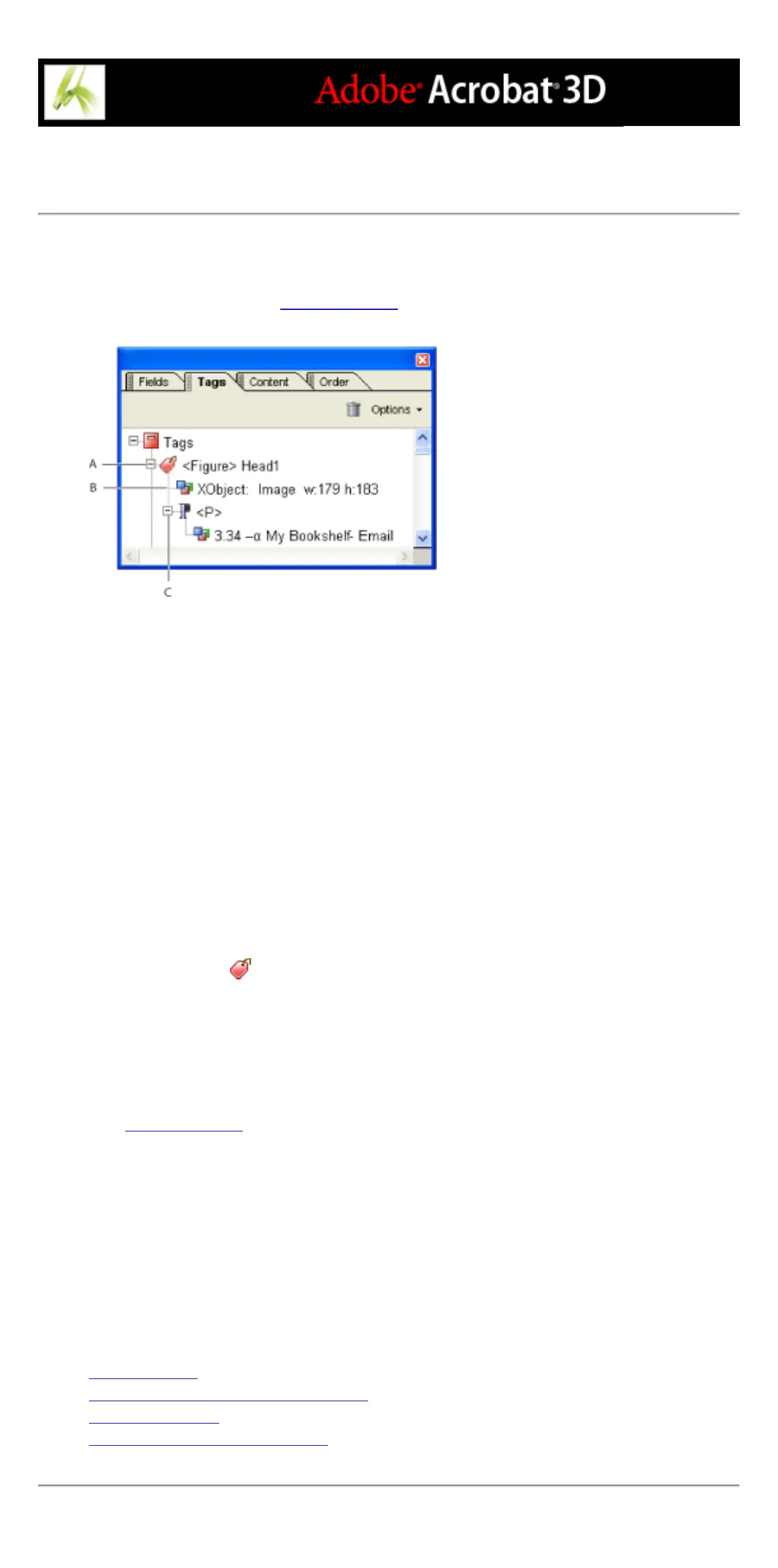Logical structure tree in the Tags tab A. Figure tag B. Image content C. Paragraph tag